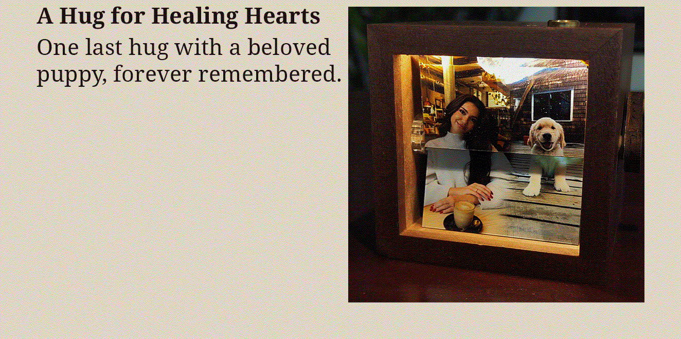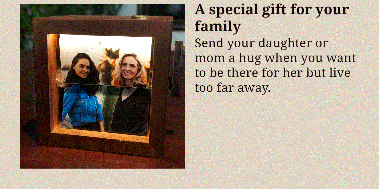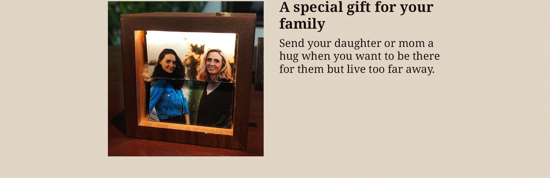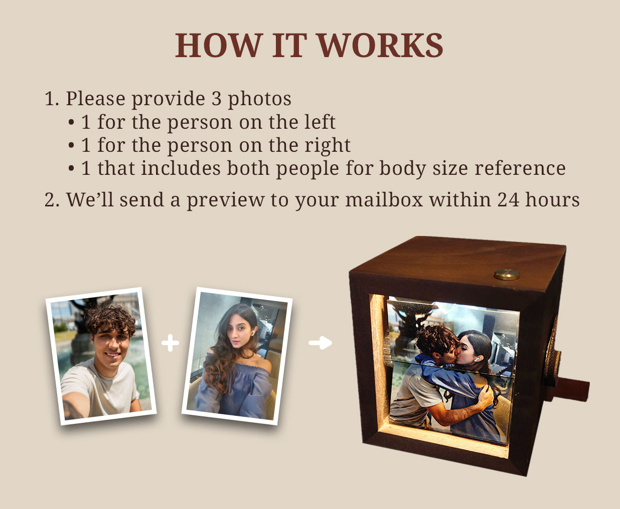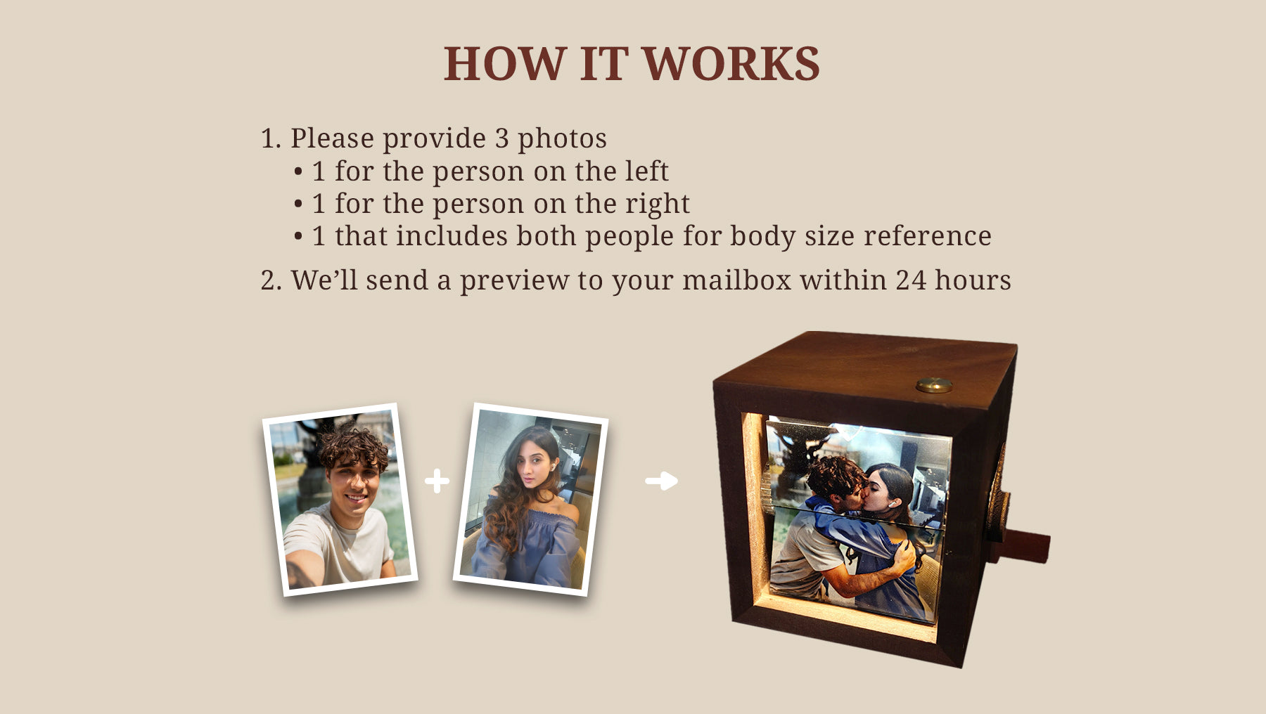 Simply send us two photos—one of each person—and a third photo together for size reference. Then, our artists will create a heartwarming animation of you embracing. We’ll then craft it into a flipbook you can replay anytime, capturing the feeling of closeness even across miles.